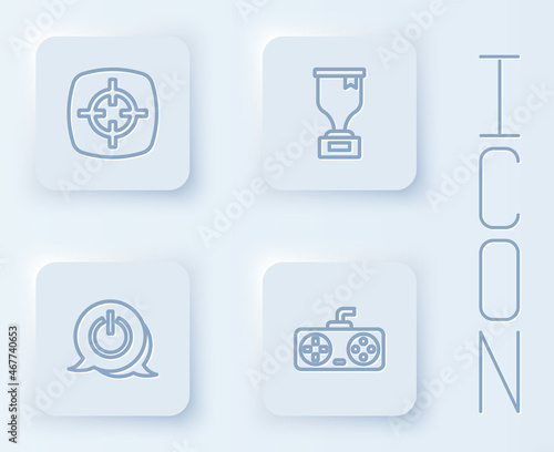Set line Target sport, Award cup, Power button and Game controller joystick. White square button. Vector