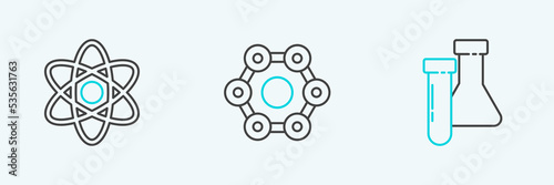 Set line Test tube and flask chemical, Atom and Chemical formula icon. Vector