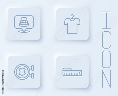 Set line Thimble for sewing, T-shirt on hanger, Leather and Tape measure. White square button. Vector