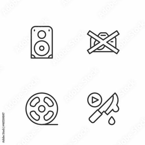 Set line Thriller movie, Film reel, Stereo speaker and Prohibition no video recording icon. Vector