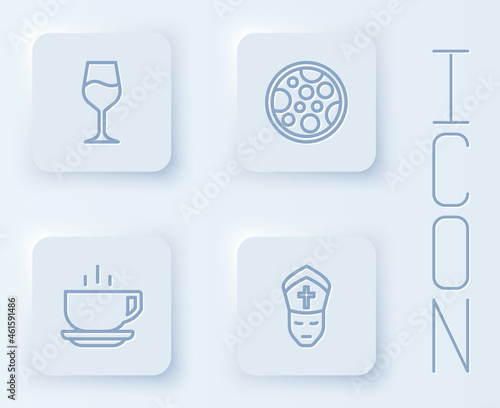 Set line Wine glass, Pizza, Coffee cup and Pope. White square button. Vector
