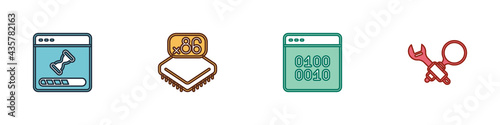 Set Loading data window, Processor with microcircuits CPU, Binary code and Debugging icon. Vector
