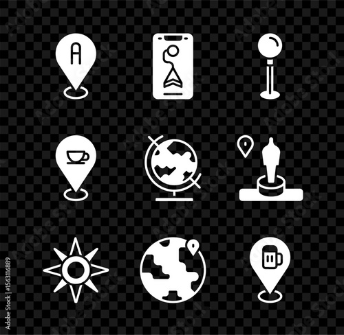 Set Location, City map navigation, Push pin, Wind rose, the globe, Alcohol or beer bar location, with coffee cup and Earth icon. Vector