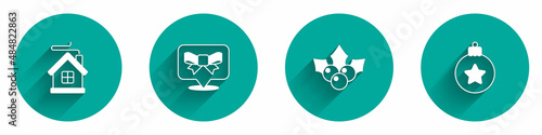Set Merry Christmas house, Gift bow, Branch viburnum and ball icon with long shadow. Vector