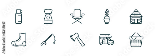 set of 10 linear icons from camping concept. outline icons such as thermo, toilet, chair, hatchet, camper, picnic vector