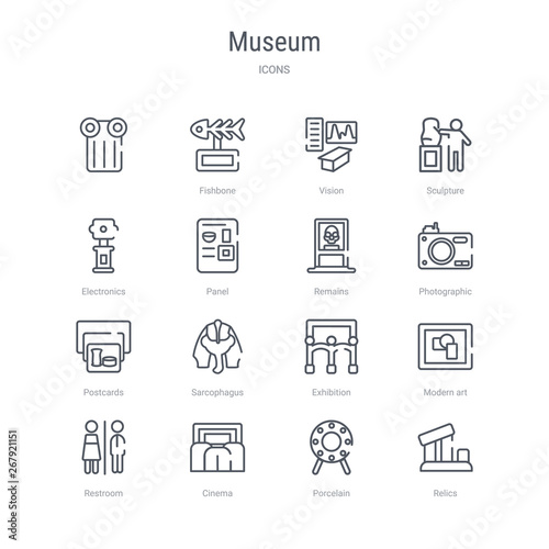 set of 16 museum concept vector line icons such as relics, porcelain, cinema, restroom, modern art, exhibition, sarcophagus, postcards. 64x64 thin stroke icons