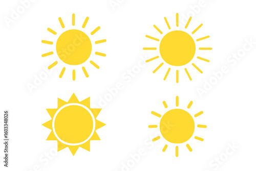 Set of 4 sun icons. Yellow sunshine shape collection. Summer sunbeam, sunlight burst and sunrise symbol. Flat simple graphic element for logo or weather forecast sign.
