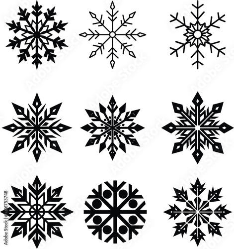 Set of 9 snowflake silhouette clipart vector illustration. Flower icon collection isolated on white. New Year decoration elements, frozen symbol and shapes.