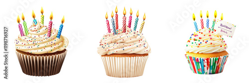 Set of A close-up shot of a delicious cupcake with fluffy vanilla frosting, colorful sprinkles, and a soft, moist texture, perfect for a birthday celebration on transparent png background