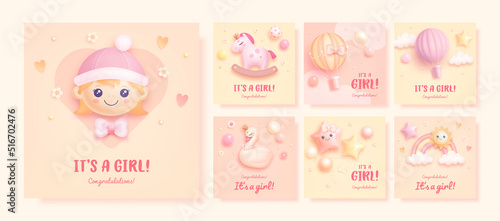 Set of baby shower invitation with cartoon hot air balloon, horse, swan, rainbow, sun, helium balloons and flowers on pink and beige background. It's a girl. Vector illustration
