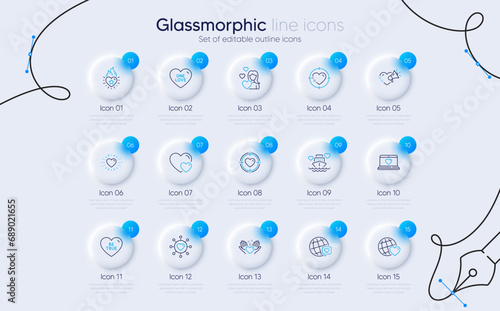 Set of Be true, Heart flame and World brand line icons for web app. Friends world, One love, Love message icons. Dating network, Heart target, Honeymoon cruise signs. Valentine target, Hearts. Vector