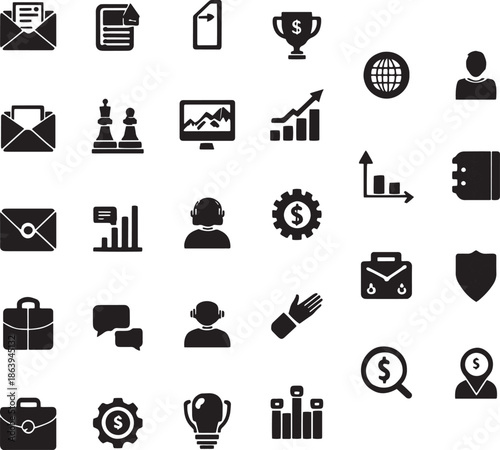 Set of black business and finance icons featuring vector symbols for web design, computer communication, money, bank, and email illustrations in a professional silhouette style.