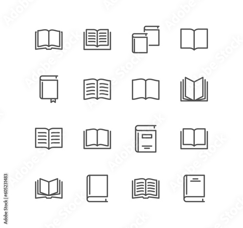 Set of book related icons, organizer, learning, reader, diary, library, textbook, pages, education and linear variety vectors.