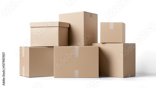 Set of brown cardboard boxes for packaging, delivery and storage. Transparent background, png