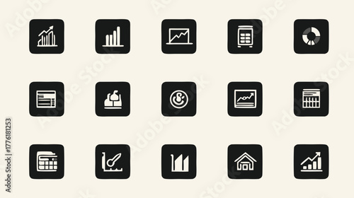 Set of Business, Finance, and Data Analysis Icons. Graphs, Charts, Calculator, and Spreadsheet Symbols for Reporting.