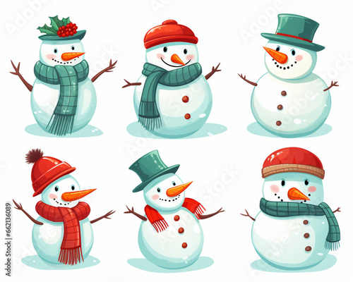 set of christmas snowman cartoon, a group of snowmen in hats, santa hats, scarfs and gifts, snowman vector set in cartoon style