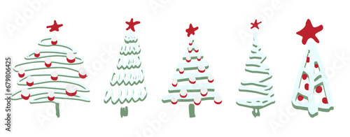 Set of Christmas tree. Sketch hand drawn xmas pattern. Doodle childlike silhouette art. Winter New year holiday firs, decor elements on isolated background. Vector vintage illustration.
