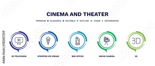 set of cinema and theater thin line icons. cinema and theater outline icons with infographic template. linear icons such as 3d television, stripped ice cream cone, box office, movie camera, 3d