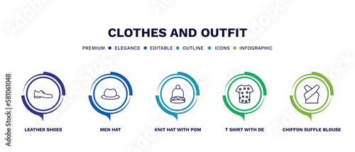 set of clothes and outfit thin line icons. clothes and outfit outline icons with infographic template. linear icons such as leather shoes, men hat, knit hat with pom pom, t shirt with de, chiffon
