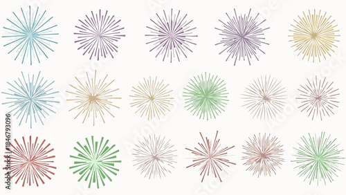 Set of colorful abstract sunburst starburst elements, retro graphic design, isolated on white