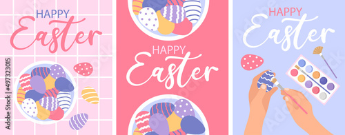 Set of colorful postcards or posters with colored eggs. Happy Easter greeting card. Flat vector illustrations.