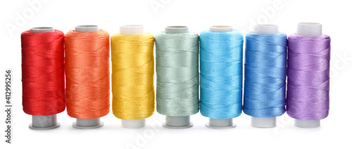 Set of colorful sewing threads on white background