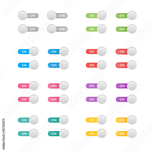Set of colorful toggle switch icons. Switch buttons. On and Off position. Vector user interface set including switches.