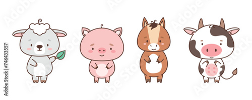Set of cute farm animals sheep piggy horse cow. Cute animals in kawaii style. Drawings for children. vector illustration