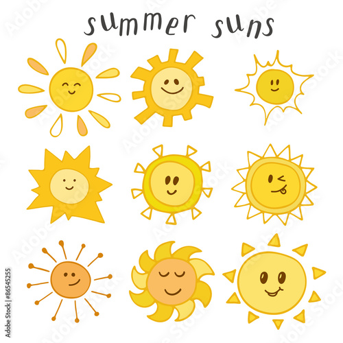 Set of cute summer suns. Hand drawn smiley suns