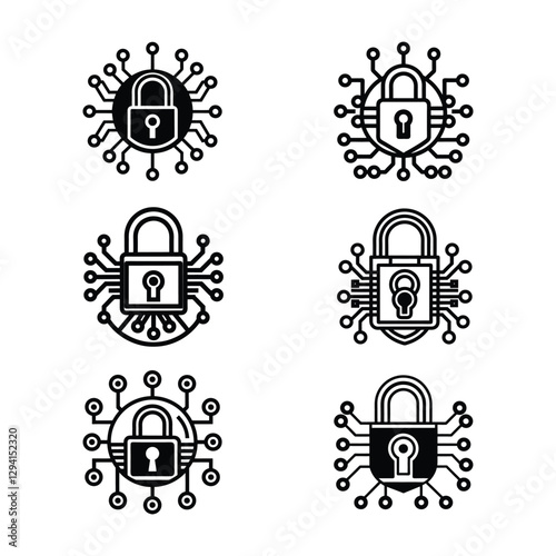 Set of cyber security data analysis digital system lock symbol iconic vector art
