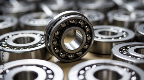 Set of deep groove ball and roller bearings on a gray background with soft focus. Neural network ai generated art