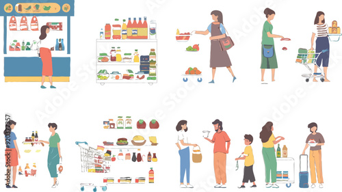 Set of different customers in a grocery store. People make purchases of food and drinks Vector flat illustrations on a white background