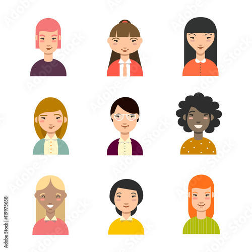 Set of diverse women avatars. Business avatars set. Different nationalities, clothes, hair styles. Vector.