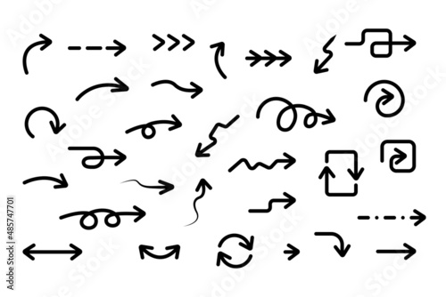 Set of drawn grunge arrows, doodle arrows, arrow silhouettes, pointers in the form of arrows in doodle style. Isolated on white background. Vector illustration