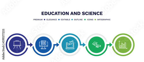 set of education and science thin line icons. education and science outline icons with infographic template. linear icons such as canvas, online test, science in a laptop, graduating, bars vector.