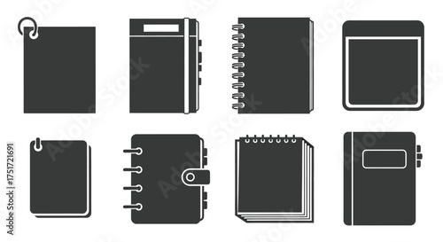 Set of eight different notebook and journal icons with simple dark gray outlines vector