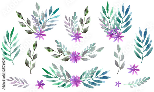 Set of five compositions with twigs and flowers, watercolor branches and purple flowers