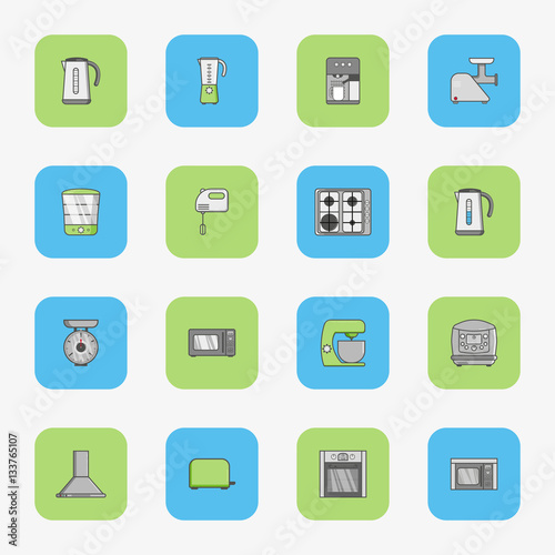 Set of flat dquare icons for kitchen equipment such as kettle, oven, microwave, blender, mixer, steamer, coffee machine, scales, meat grinder