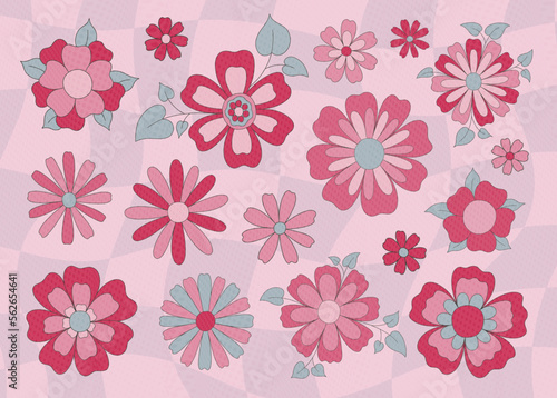 Set of flat flowers in retro style. Abstract vintage style 1960-1970. In trendy 2023 colors Viva magenta.