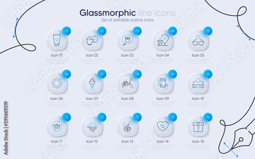 Set of Flight destination, Grill place and Gift dream line icons for web app. Mountain bike, Ice cream, Coffee break icons. Call me, Secret gift, Sunglasses signs. Sun protection, SunriseSun. Vector