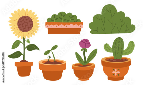 set of flowers in flower pot. sprout, flower, cactus, bush. Flat color illustration in form of doodles. Pleasant spring and summer. Suitable decoration, postcards, packaging, prints, covers with cozy