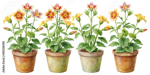 Set of Four Small Separate Mimulus Guttatus (Seep Monkeyflower) Plants Isolated on Transparent Background, Great for Floral and Wetland Plant Projects