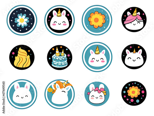 Set of fun stickers with little flowers, stars, rainbows, kittens and various kawaii pets for decoration of all kinds on a transparent background.
