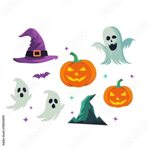 set of halloween elements icons a ghost witch hat pumpkin and bat