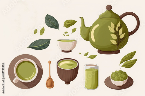 Set of hand drawn Japanese matcha tea ingredient and traditional ceremony elements, matcha latte, pie, dessert, cup, spoon, matcha leaf.