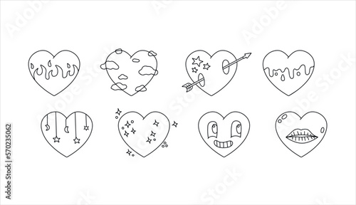 Set of hearts. Collection of retro vintage sticker. Hippie surreal icon of love