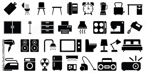Set of home appliance icon vector for kitchen tools, cleaning devices, and house electronics. Ideal for household product ads, service repair visuals, and shopping UI elements.