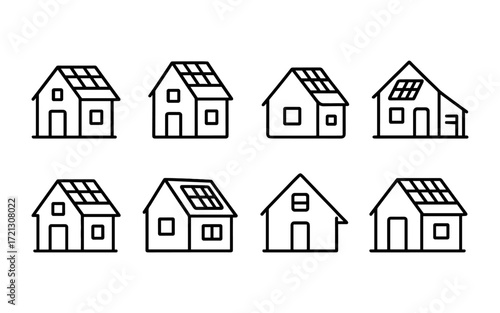 Set of house icons with solar panels on rooftops. Black outline vector pictograms of eco buildings with different window and roof shapes.