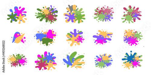 set of ink splat or splash vector illustration . Colored splatters, graffiti spots and ink blots. Paintbrush splotches, ink drips or liquid blobs. Abstract dirty grunge splatter stains