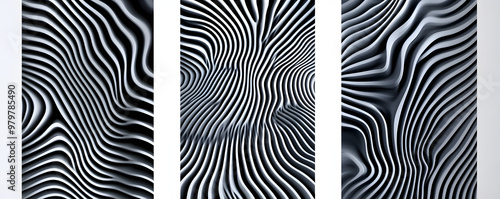 Set of layouts with wavy lines. Twisted duotone backgrounds. Abstract pattern from lines, halftone effect. Black and white texture. Minimalistic design template for poster, banner, cover, postcard